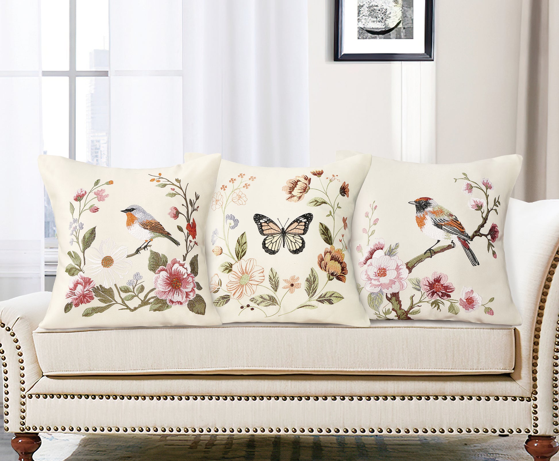 The Aviary Embroidered Throw Pillow enhances your décor with a serene, uplifting feel. Whether placed in the living room, bedroom, or a relaxation corner, its gentle nature-themed design pairs effortlessly with classic, contemporary, farmhouse, and cottage-style interiors.