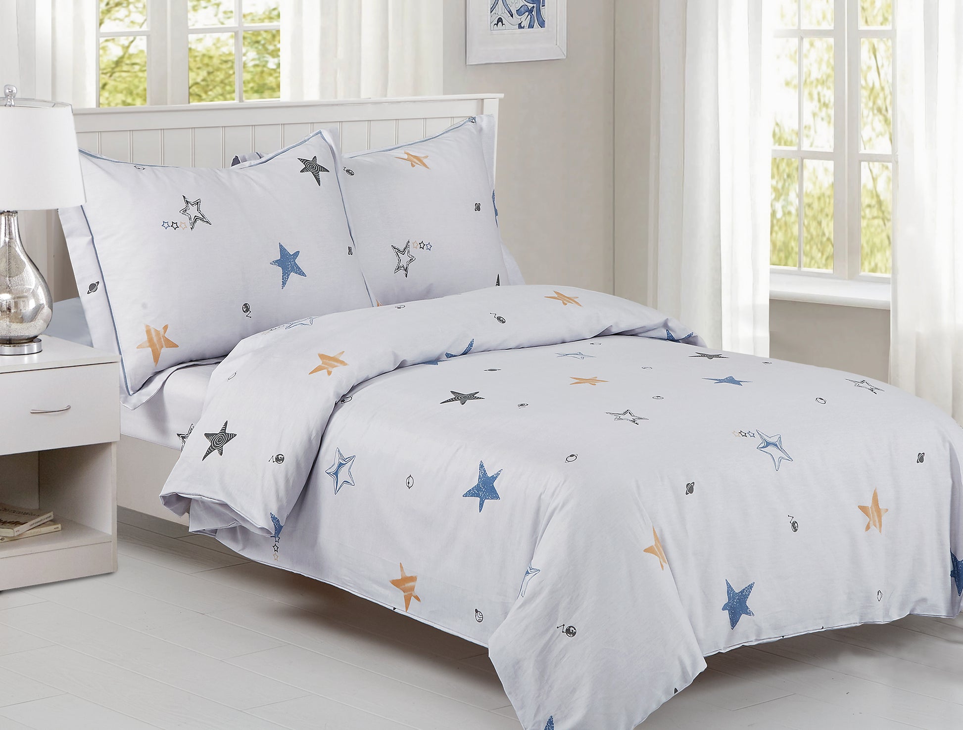 - Features a French Stars and Planets pattern for a fun, celestial-inspired bedroom look.